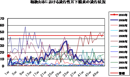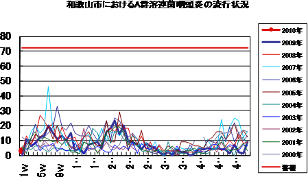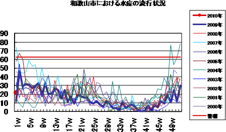 和歌山市では、2006年では第10週をピークに流行が続きましたが、2007年、2008年とも大きな流行なく少数報告にとどまっています。