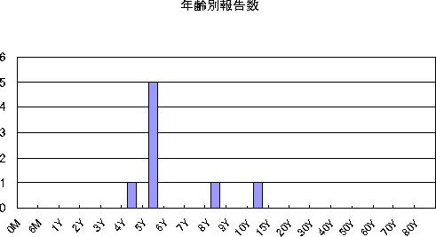 2010年では、第1週に15件の報告があり、やや増加気味でしたが、第3週6件、第4週7件で横ばいです。年齢別では、3歳〜6歳で最も多い報告ですが、10-14歳や20歳代での報告も見られます。