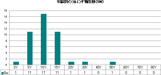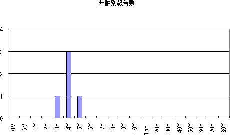 2010年では、第1週に15件の報告があり、やや増加気味でしたが、第4週7件、第5週では5件で横ばいです。年齢別では、3歳〜6歳で最も多い報告ですが、10-14歳や20歳代での報告も見られます。
