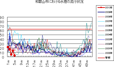 和歌山市では、2006年では第10週をピークに流行が続きましたが、2007年、2008年とも大きな流行なく少数報告にとどまっています。