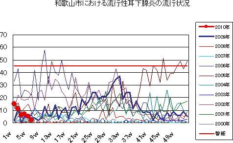 和歌山市では、2006年では第10週をピークに流行が続きましたが、2007年、2008年とも大きな流行なく少数報告にとどまっています。