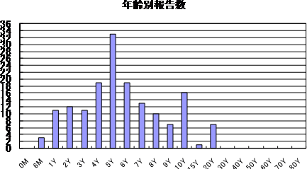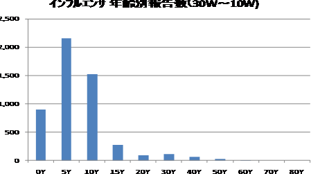 今シーズン(2009年〜2010年)では、第5週30件をピークに以後減少傾向で、第8週11件、第9週7件、第10週6件でした。 年齢別では、0歳・1歳での報告です。