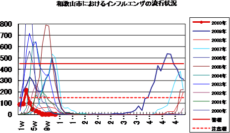 本年5月には、新型インフルエンザ(H1N1)の国内発生例があり、5月27日には和歌山市内で初めて新型インフルエンザ感染者が確認されました。6月後半以降は、全国的に感染者の確認が続き、集団感染事例も多数発生しました。第33週には、定点当たり1.69と増加し、流行の入口に達したと国は発表しました。