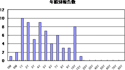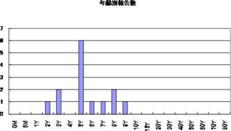 今シーズン(2009年〜2010年)では、第5週30件をピークに以後減少傾向で、第第9週7件、第10週6件、第11週2件第12週1件と終息傾向です。 年齢別では、0-5か月での報告です。