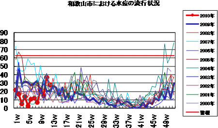 2009年は比較的少ない状況で推移していましたが、年末には例年の推移に沿いながら増加傾向となりましたが、2010年に入ってから減少し、例年に比べて低いめの発生状況ですが、第9週は22件とやや増加、第10週15件、第11週は37件と増加です。第12週は28件に減少しましたが、今後の動向に注意が必要です。