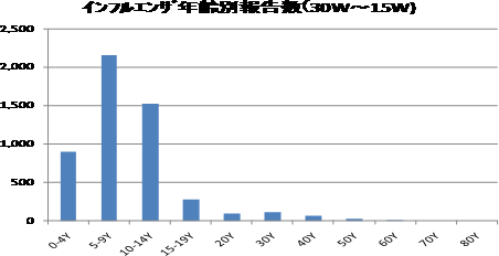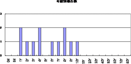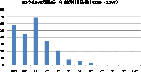 2009年第43週から2010年第15週までの年齢別報告数は次の図のとおりです。0歳児で最も多く、1歳児、2歳児の順で、6歳児までの報告でした。