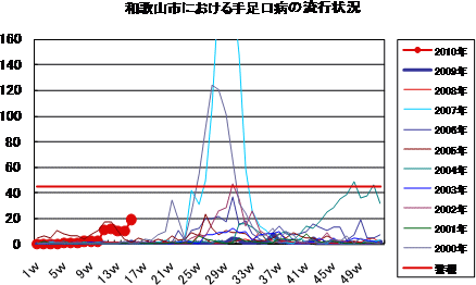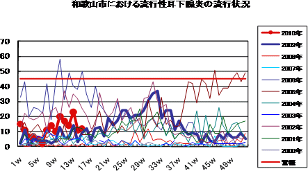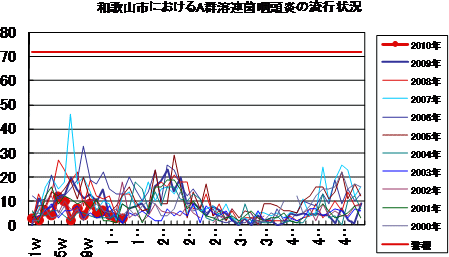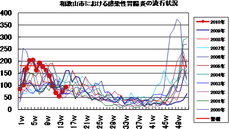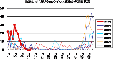 和歌山市では、2006年では第10週をピークに流行が続きましたが、2007年、2008年とも大きな流行なく少数報告にとどまっています。