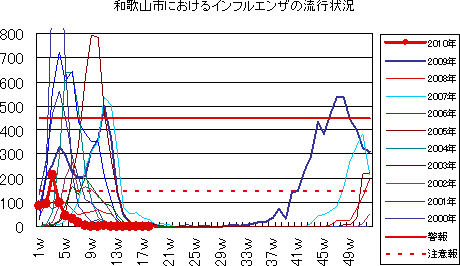 2009年5月には、新型インフルエンザ(H1N1)の国内発生例があり、5月27日には和歌山市内で初めて新型インフルエンザ感染者が確認されました。6月後半以降は、全国的に感染者の確認が続き、集団感染事例も多数発生しました。第33週には、定点当たり1.69と増加し、流行の入口に達したと国は発表しました。