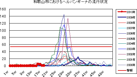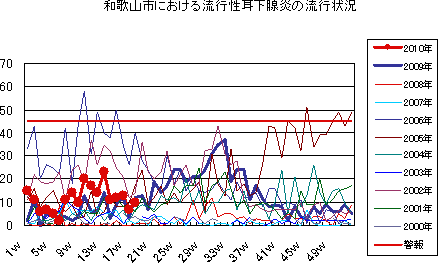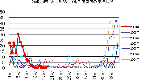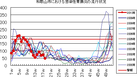 和歌山市では、2006年では第10週をピークに流行が続きましたが、2007年、2008年とも大きな流行なく少数報告にとどまっています。