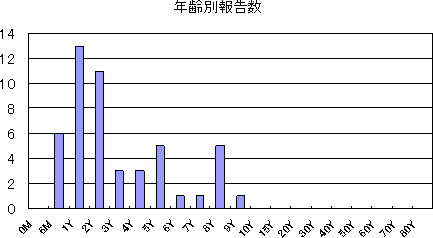 2008年は、第10〜46週に計23件、2009年は、第16〜24週に計6件でした。2008年、2009年の年齢別の届出状況は次のとおりです。