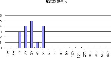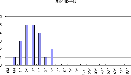 2009年第43週から2010年第15週までの年齢別報告数は次の図のとおりです。0歳児で最も多く、1歳児、2歳児の順で、6歳児までの報告でした。