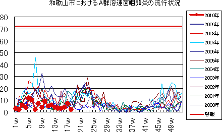 2010年では、第10週まで2件以内、第11〜14週では10〜12件、第15週には19件に増加し、第16週は31件、第17週44件(定点当り4.89)と急増中で、通常より非常に早い立ち上がりとなっています。第18週は17件(定点当り1.89)でしたが、第18週は大型連休を含むため各機関よりの報告数が減少傾向にあることが予想されます。今後の動向に要注意です。