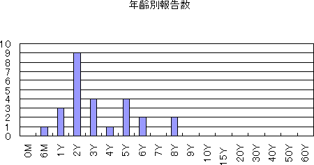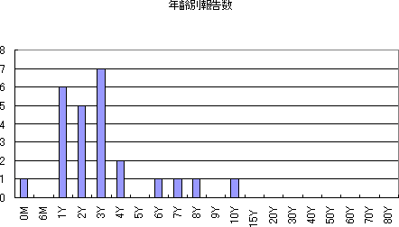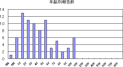 2009年第43週から2010年第15週までの年齢別報告数は次の図のとおりです。0歳児で最も多く、1歳児、2歳児の順で、6歳児までの報告でした。