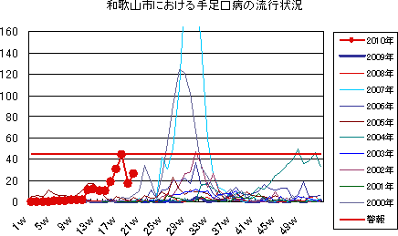 2010年では、第10週まで2件以内、第11〜14週では10〜12件、第15週には19件に増加し、第16週は31件、第17週44件(定点当り4.89)と急増中で、通常より非常に早い立ち上がりとなっています。第18週は17件(定点当り1.89)でしたが、第18週は大型連休を含むため各機関よりの報告数が減少傾向にあることが予想されます。第19週は26件(定点当り2.89)でした。今後の動向に要注意です。