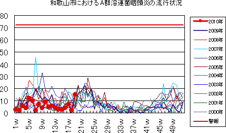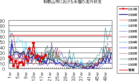 和歌山市では、2006年では第10週をピークに流行が続きましたが、2007年、2008年とも大きな流行なく少数報告にとどまっています。