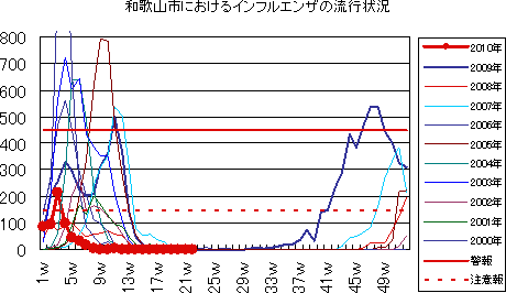 2009年5月、新型インフルエンザ(H1N1)の国内発生例があり、5月27日には和歌山市内で初めて新型インフルエンザ感染者が確認されました。6月後半以降は、全国的に感染者の確認が続き、集団感染事例も多数発生しました。第33週には、定点当たり1.69と増加し、流行の入口に達したと国は発表しました。