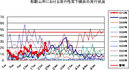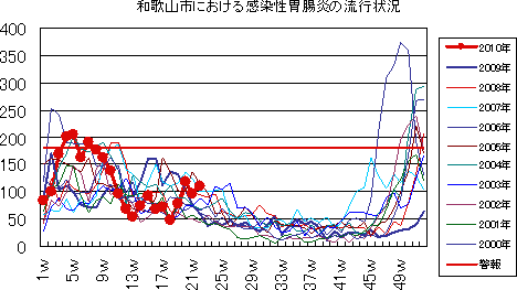 和歌山市では、2006年では第10週をピークに流行が続きましたが、2007年・2008年は大きな流行がなく少数報告にとどまりました。2009年は、第30〜32週ごろをピークに緩やかな流行を示しました。