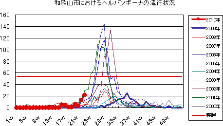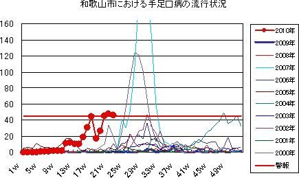 手足口病は、ヘルパンギーナとともに、7月の第1週をピークとする流行が毎年繰り返されますが、手足口病の発生は、初冬まで続いたり、殆ど発生が見られない年もあります。和歌山市では、2009年は、殆ど1年間報告がありませんでした。