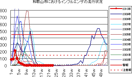 2009年5月、新型インフルエンザ(H1N1)の国内発生例があり、5月27日には和歌山市内で初めて新型インフルエンザ感染者が確認されました。6月後半以降は、全国的に感染者の確認が続き、集団感染事例も多数発生しました。第33週には、定点当たり1.69と増加し、流行の入口に達したと国は発表しました。