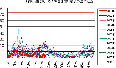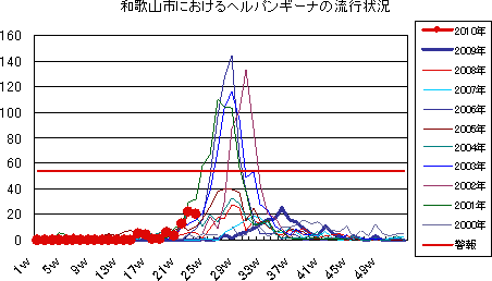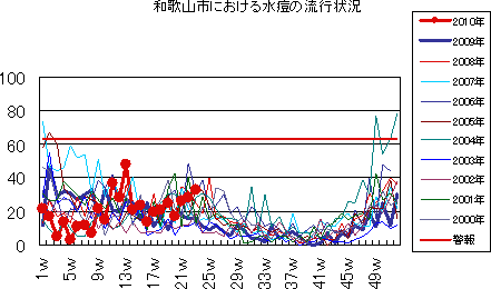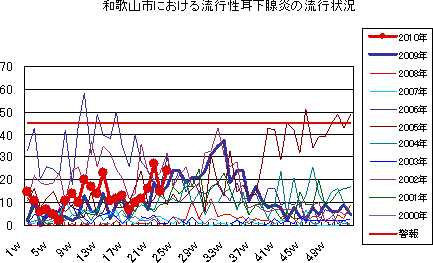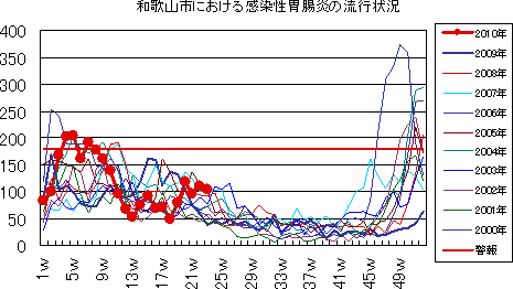 和歌山市では、2006年では第10週をピークに流行が続きましたが、2007年・2008年は大きな流行がなく少数報告にとどまりました。2009年は、第30〜32週ごろをピークに緩やかな流行を示しました。