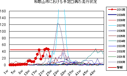手足口病は、ヘルパンギーナ同様、7月の第1週をピークとする流行が特徴的です。年によっては、初冬まで発生が続くことや、逆に殆ど発生が見られないこともあります。和歌山市では、2009年は殆ど1年間報告がありませんでした。