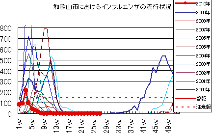 2009年5月、新型インフルエンザ(H1N1)の国内発生例があり、5月27日には和歌山市内で初めて新型インフルエンザ感染者が確認されました。6月後半以降は、全国的に感染者の確認が続き、集団感染事例も多数発生しました。第33週には、定点当たり1.69と増加し、流行の入口に達したと国は発表しました。