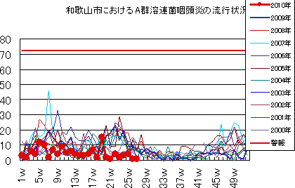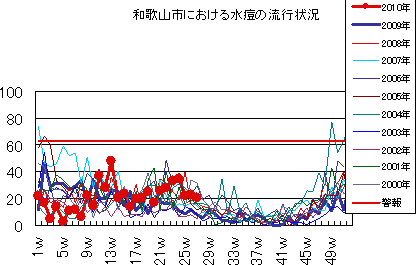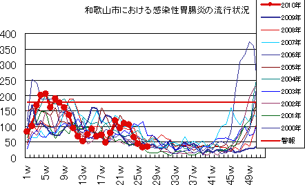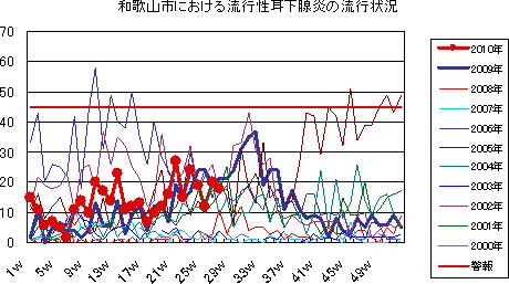 和歌山市では、2006年では第10週をピークに流行が続きましたが、2007年・2008年は大きな流行がなく少数報告にとどまりました。2009年は、第30〜32週ごろをピークに緩やかな流行を示しました。