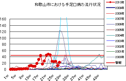 手足口病は、ヘルパンギーナ同様、7月の第1週をピークとする流行が特徴的です。年によっては、初冬まで発生が続くことや、逆に殆ど発生が見られないこともあります。和歌山市では、2009年は殆ど1年間報告がありませんでした。
