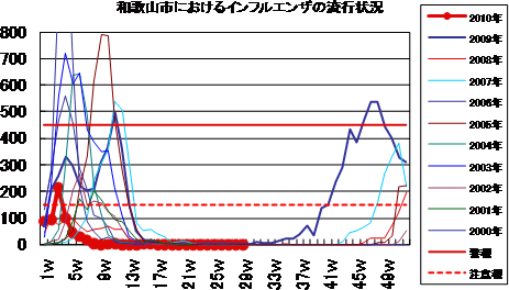 2009年5月、新型インフルエンザ(H1N1)の国内発生例があり、5月27日には和歌山市内で初めて新型インフルエンザ感染者が確認されました。6月後半以降は、全国的に感染者の確認が続き、集団感染事例も多数発生しました。第33週には、定点当たり1.69と増加し、流行の入口に達したと国は発表しました。