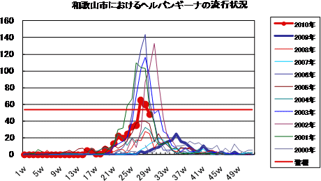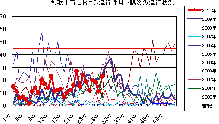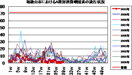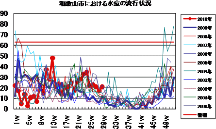 和歌山市では、2006年では第10週をピークに流行が続きましたが、2007年・2008年は大きな流行がなく少数報告にとどまりました。2009年は、第30〜32週ごろをピークに緩やかな流行を示しました。2010年は、第1週が15件で、一旦減少した後、第7週以降は10〜20件の報告が続いていました。第21週に27件と一度増加しましたが、その後は増減を繰り返しながら減少し、第28週11件、第29週は23件となっております。今後もしばらく注意が必要です。
