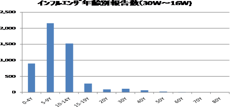 以後徐々に減少しましたが、第20-24週には100件前後の報告がありました。第25週以降は50件以下です。第31週・32週とも31件でした。年齢別では幼児と小学生での報告が中心です。