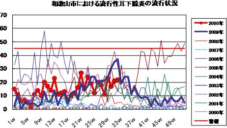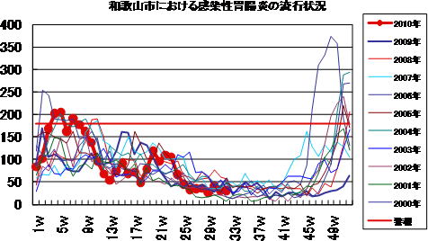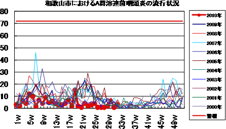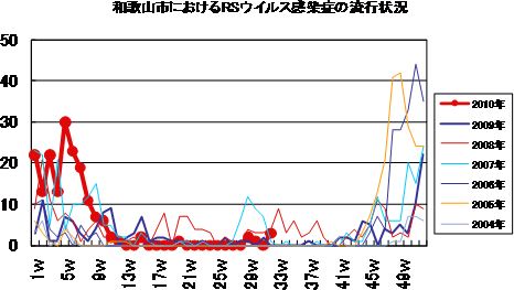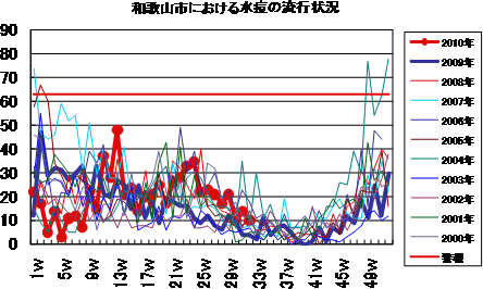 和歌山市では、2006年では第10週をピークに流行が続きましたが、2007年・2008年は大きな流行がなく少数報告にとどまりました。2009年は、第30〜32週ごろをピークに緩やかな流行を示しました。2010年は、第1週が15件で、一旦減少した後、第7週以降は10〜20件の報告が続いていました。第21週に27件と一度増加、その後は増減を繰り返し、第28週11件、第29週は23件、第30週17件です。今後もしばらく注意が必要です。
