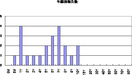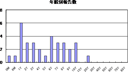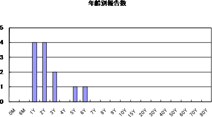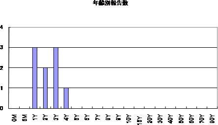2009年〜2010年シーズンでは、第41週以降報告が続き、第51週10件から第52週22件と急増しています。2010年に入り、第5週の30件をピークに以後徐々に減少、第11週以降は3件以下に収束しました。第31週は0件、第32週は3件と少数報告が見られています。年齢別では、1歳以下の乳児です。