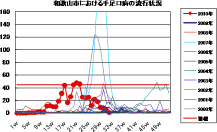 手足口病は、ヘルパンギーナ同様、7月の第1週をピークとする流行が特徴的です。年によっては、初冬まで発生が続くことや、逆に殆ど発生が見られないこともあります。和歌山市では、2009年は殆ど1年間報告がありませんでした。