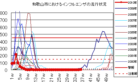 2009年5月、新型インフルエンザ(H1N1)の国内発生例があり、5月27日には和歌山市内で初めて新型インフルエンザ感染者が確認されました。6月後半以降は、全国的に感染者の確認が続き、集団感染事例も多数発生しました。第33週には、定点当たり1.69と増加し、流行の入口に達したと国は発表しました。