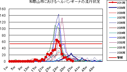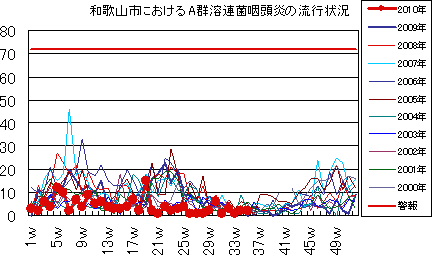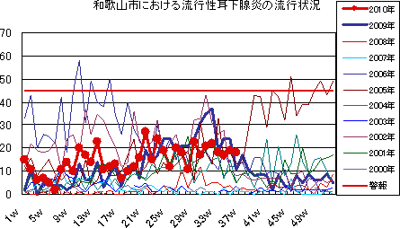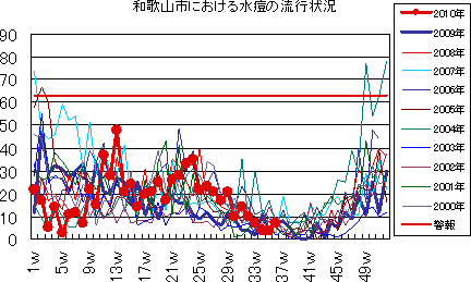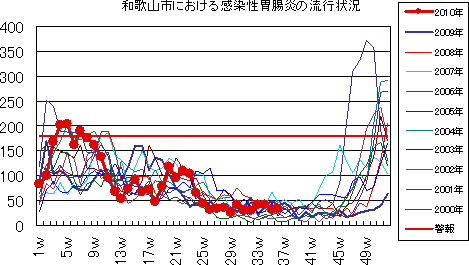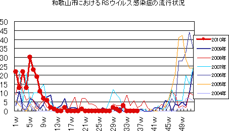 和歌山市では、2006年では第10週をピークに流行が続きましたが、2007年・2008年は大きな流行がなく少数報告にとどまりました。2009年は、第30〜32週ごろをピークに緩やかな流行を示しました。2010年は、第1週が15件で、一旦減少した後、第7週以降は増減を繰り返しつつおおむね10-20件前後でほぼ横ばいの傾向です。第36週18件でした。今後もしばらく注意が必要です。