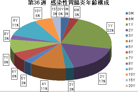 以後徐々に減少しましたが、第20-24週には100件前後の報告がありました。第25週以降は50件以下です。第36週は35件でした。年齢別では幼児と小学生での報告が中心です。