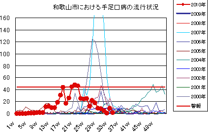 手足口病は、ヘルパンギーナ同様、7月の第1週をピークとする流行が特徴的です。年によっては、初冬まで発生が続くことや、逆に殆ど発生が見られないこともあります。和歌山市では、2009年は殆ど1年間報告がありませんでした。