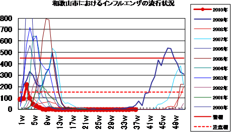 2009年5月、新型インフルエンザ(H1N1)の国内発生例があり、5月27日には和歌山市内で初めて新型インフルエンザ感染者が確認されました。6月後半以降は、全国的に感染者の確認が続き、集団感染事例も多数発生しました。第33週には、定点当たり1.69と増加し、流行の入口に達したと国は発表しました。