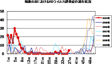 和歌山市では、2006年では第10週をピークに流行が続きましたが、2007年・2008年は大きな流行がなく少数報告にとどまりました。2009年は、第30〜32週ごろをピークに緩やかな流行を示しました。2010年は、第1週が15件で、一旦減少した後、第7週以降は増減を繰り返しつつおおむね10-20件前後でほぼ横ばいの傾向です。第37週22件でした。今後もしばらく注意が必要です。