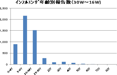 以後徐々に減少しましたが、第20-24週には100件前後の報告がありました。第25週以降は50件以下です。第39週は37件でした。年齢別では幼児と小学生での報告が中心です。