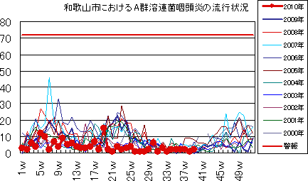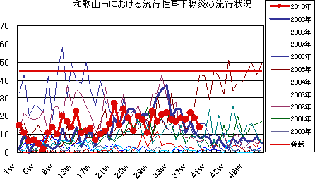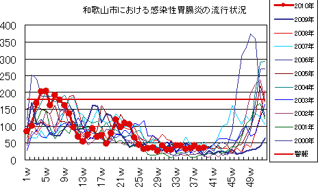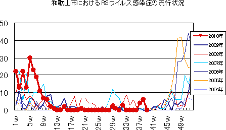和歌山市では、2006年では第10週をピークに流行が続きましたが、2007年・2008年は大きな流行がなく少数報告にとどまりました。2009年は、第30〜32週ごろをピークに緩やかな流行を示しました。2010年は、第1週が15件で、一旦減少した後、第7週以降は増減を繰り返しつつおおむね10-20件前後でほぼ横ばいの傾向です。第39週14件でした。今後もしばらく注意が必要です。