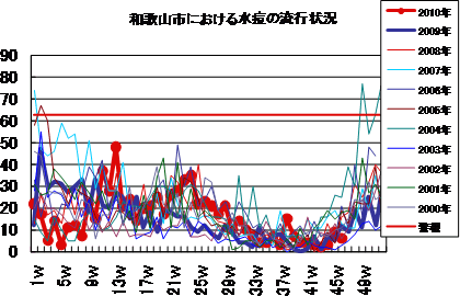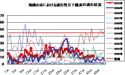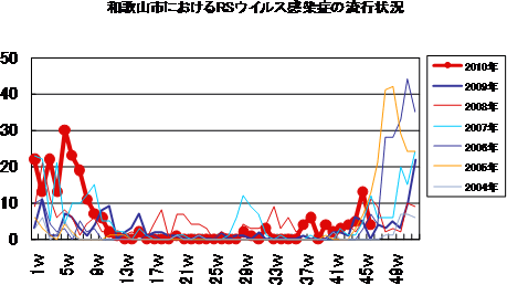 和歌山市では、2006年では第10週をピークに流行が続きましたが、2007年・2008年は大きな流行がなく少数報告にとどまりました。2009年は、第30〜32週ごろをピークに緩やかな流行を示しました。2010年は、第1週が15件で、一旦減少した後、第7週以降は増減を繰り返しつつおおむね10-20件前後でほぼ横ばいの傾向です。第45・46週とも12件でした。