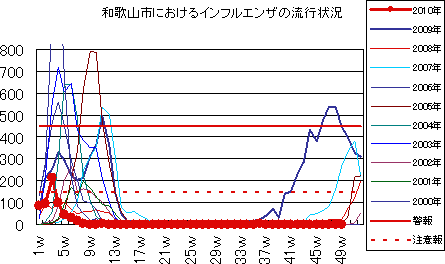 2009-2010年は、新型インフルエンザ(A/H1N1pdm)の流行により、和歌山市でも、第35週(8/24-)に定点当たり報告数1.33と全国より2週遅れて流行が始まりました。第42週(10/12-)に15.67で注意報発令、第46週(11/9-)に31.4で警報発令となり、第47週(11/16-)はさらに35.8に増加しピークを迎えました。第48週以降はやや減少傾向にあり、第53週(12/28-)114件(7.60)→第1週(1/4-)88件(5.87)と緩やかに減少しました。新学期が再開後、一時期は増加傾向を示していましたが、第4週以降減少傾向で第17週(4/26-)以降は0件が続いていました。
