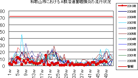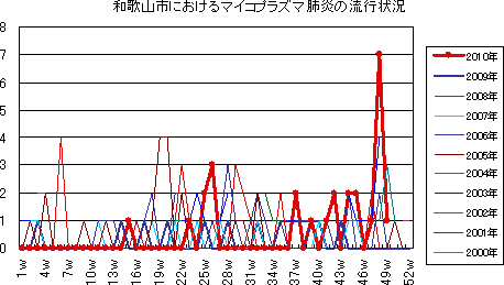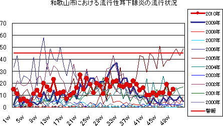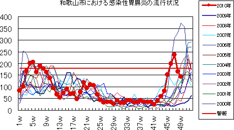 和歌山市では、2006年では第10週をピークに流行が続きましたが、2007年・2008年は大きな流行がなく少数報告にとどまりました。2009年は、第30〜32週ごろをピークに緩やかな流行を示しました。2010年は、第1週が15件で、一旦減少した後、第7週以降は増減を繰り返しつつおおむね10-20件前後でほぼ横ばいの傾向です。第49週は15件でした。