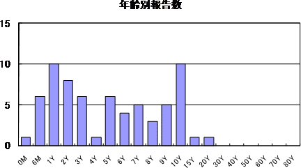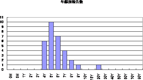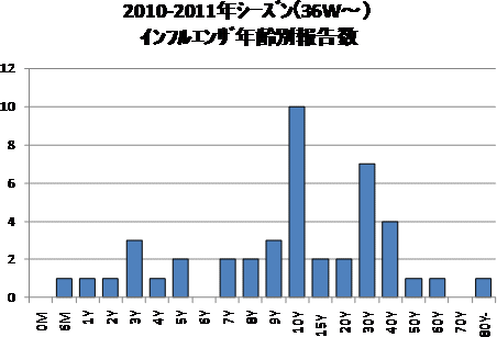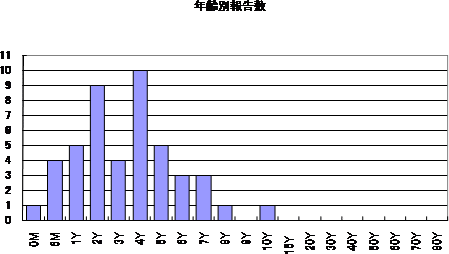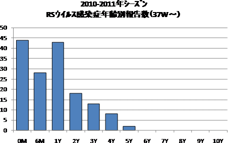 今シーズン(2010-2011年)は、第45週により10件前後で報告がみられておりましたが、第49週では18件、第50週16件から、第51週26件に増加しています。第52週は19件、第1週は12件でしたが、今後も流行の継続が危惧されます。年齢別では、0歳〜5歳の範囲で報告がみられています。今後も流行の継続が危惧されるため、注意が必要です。