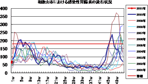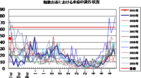 和歌山市では、2006年では第10週をピークに流行が続きましたが、2007年・2008年は大きな流行がなく少数報告にとどまりました。2009年は、第30〜32週ごろをピークに緩やかな流行を示しました。2010年は、おおむね10-20件前後でほぼ横ばいの傾向でした。