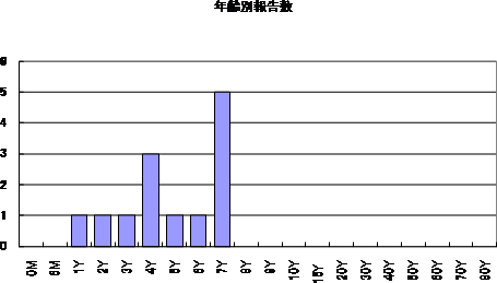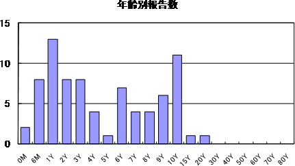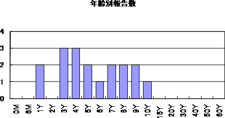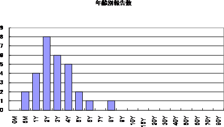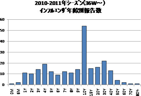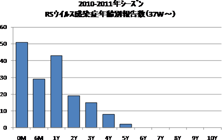 今シーズン(2010-2011年)は、第45週により10件前後で報告がみられておりましたが、第49週では18件、第50週16件から、第51週26件に増加しています。第52週は19件、第1週12件、第2週10件とやや減少、第3週では1件に減少しましたが、まだしばらく動向に注意が必要です。年齢別では、0歳〜5歳の範囲で報告がみられています。