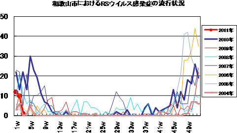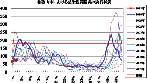 和歌山市では、2006年では第10週をピークに流行が続きましたが、2007年・2008年は大きな流行がなく少数報告にとどまりました。2009年は、第30〜32週ごろをピークに緩やかな流行を示しました。2010年は、おおむね10-20件前後でほぼ横ばいの傾向でした。