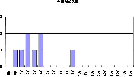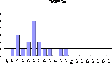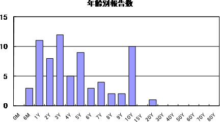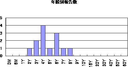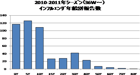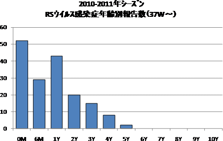 今シーズン(2010-2011年)は、第45週により10件前後で報告がみられておりましたが、第49週では18件、第50週16件から、第51週26件に増加しています。第52週は19件、第1週12件、第2週10件とやや減少、第3週では1件、第4週2件に減少しましたが、まだしばらく動向に注意が必要です。年齢別では、0歳〜5歳の範囲で報告がみられています。